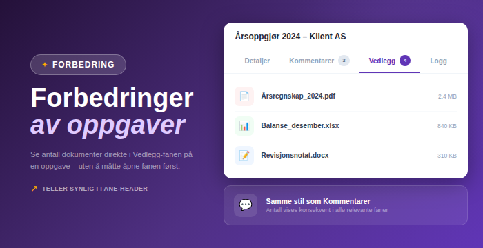 Dette gjør det raskere å se om en oppgave inneholder dokumenter uten å måtte åpne vedleggsfanen først. En liten forbedring som gjør det litt enklere å holde oversikt i hverdagen. 🚀