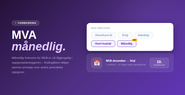 Du kan nå velge månedlig frekvens for MVA-oppgaver direkte i oppgaveplanleggeren.