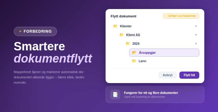Når du åpner dialogen for å flytte eller kopiere et dokument, vil mappestrukturen nå automatisk vise hvor dokumentet allerede ligger. Den aktuelle mappen åpnes og markeres i mappetreet, slik at du raskt får oversikt over nåværende plassering.